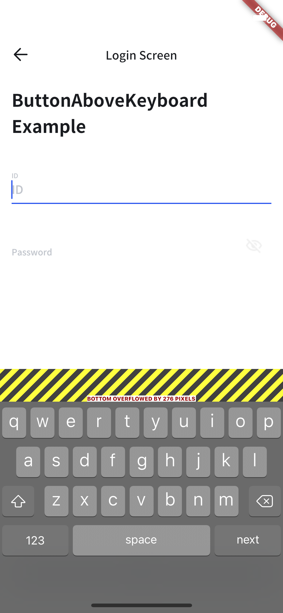 위와 같은 화면에서 TextField를 클릭해서 Keyboard가 올라가면 아래와 같은 화면과 에러를 만나실 수 있습니다.