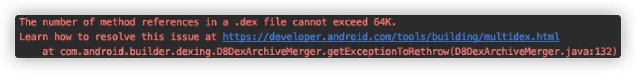 코딩을 하다보면 위와 같은 빌드 에러메시지가 발생하는 경우가 있습니다. 안드로이드 프로젝트 같은 경우 기본적으로 하나의 Dalvik Executable(Dex)형식의 실행가능한 바이트 코드 파일이 포함됩니다. 하지만, Dex파일은 메소드의 개수 65,536개가 최대이고, 메소드의 개수가 넘어갈 경우 여러개의 Dex파일을 로드할 수 있도록 멀티덱스 설정을 해주어야 합니다.
