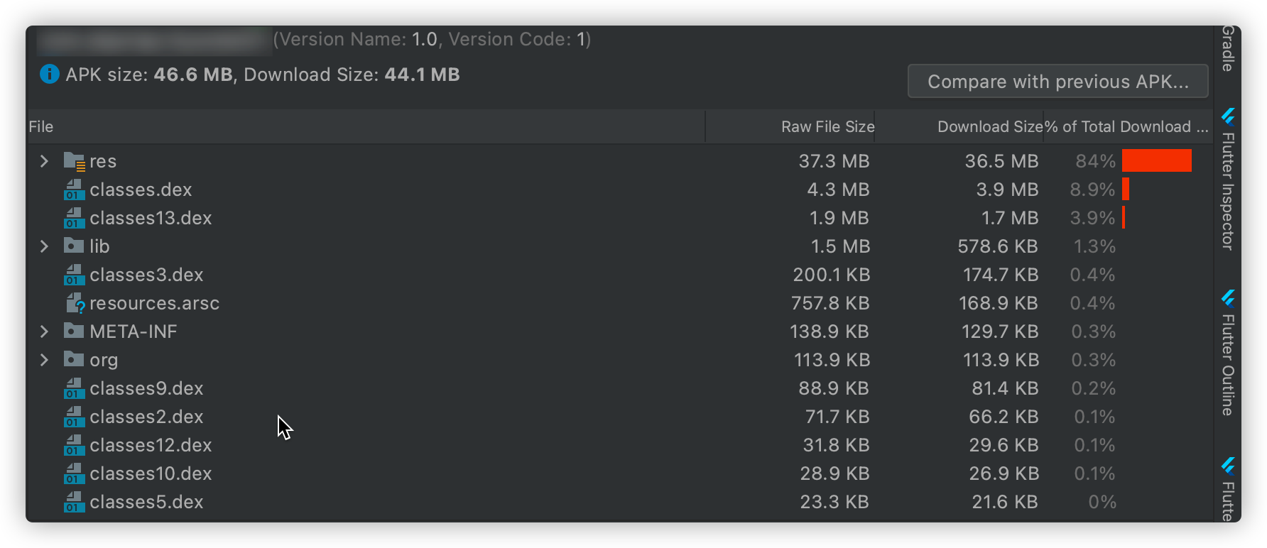 멀티덱스 적용 apk 파일(old) vs 프로가드 적용 후 apk 파일 (new)