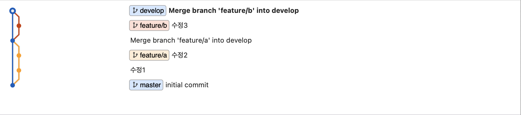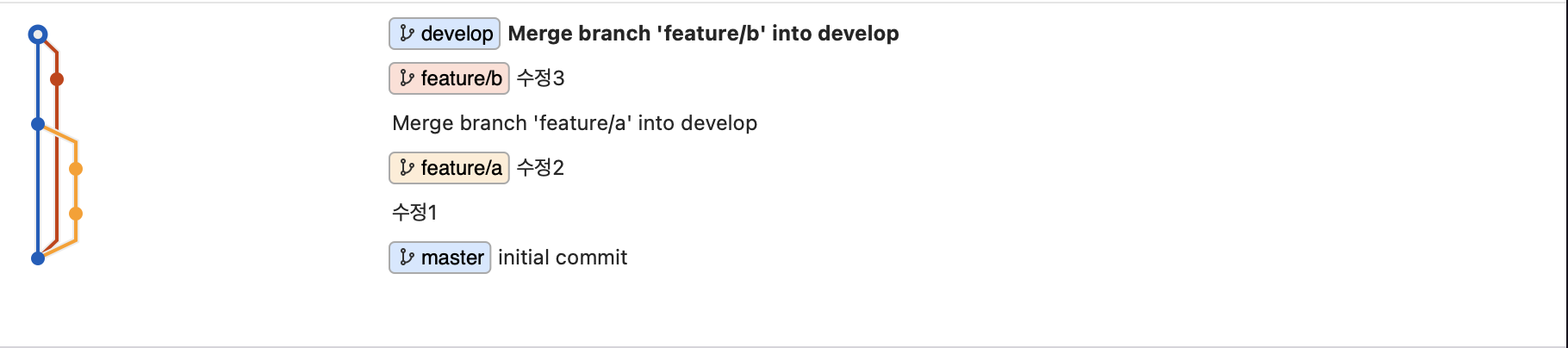 feature/b에서 작업을 모두 끝냈다거나, feature/a에서 작업한 내용들을 가져오고 싶어서 feature/b를 develop에 merge를 한다고 가정하면 위와 같은 커밋 그래프가 형성됩니다.