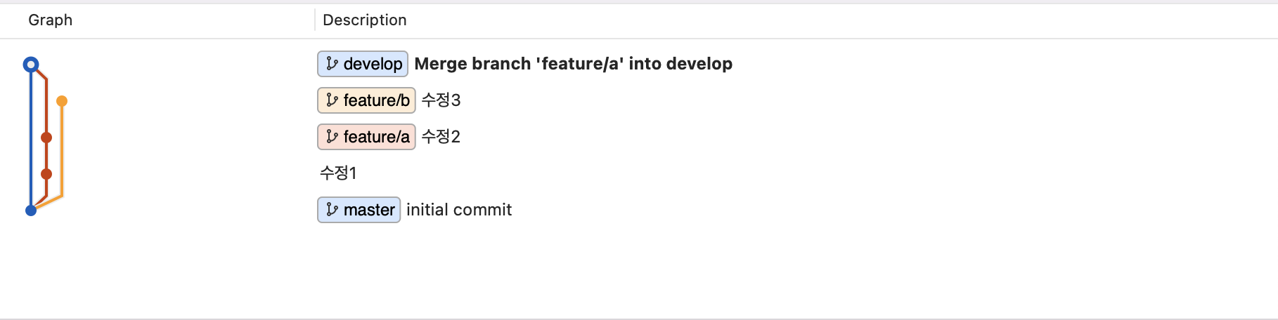 또한, feature/b의 커밋들에도 최신 변경사항들이 반영 된 커밋들로 존재하게 됩니다.