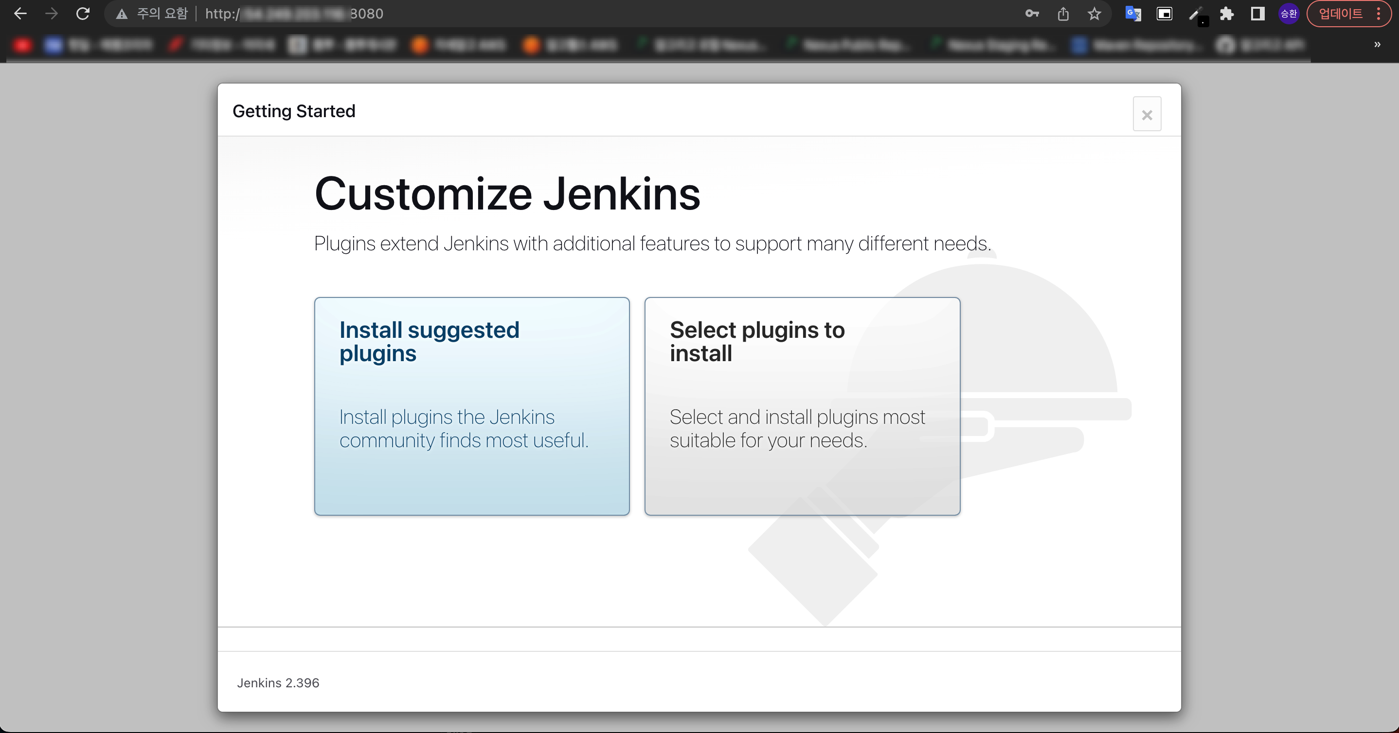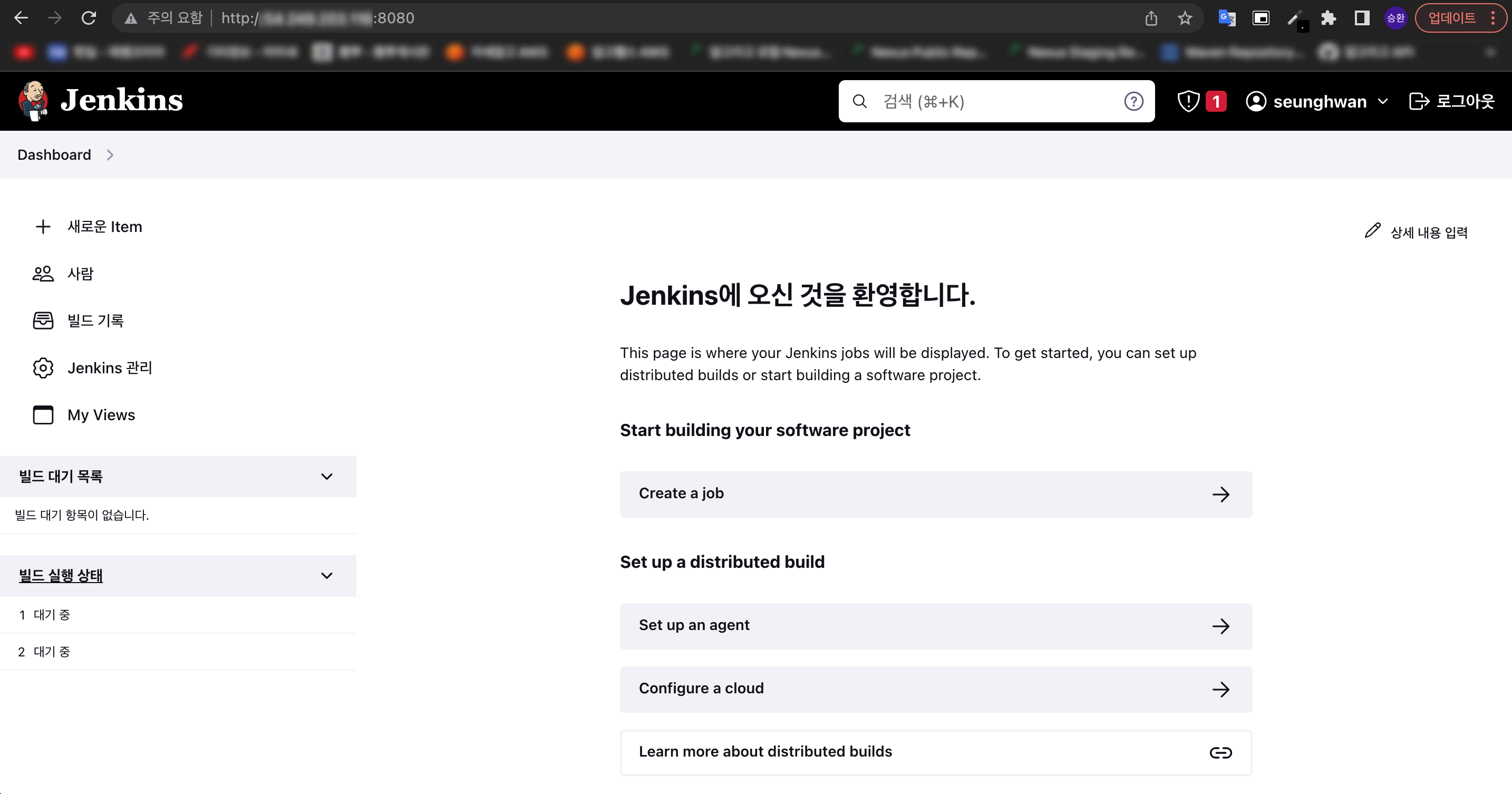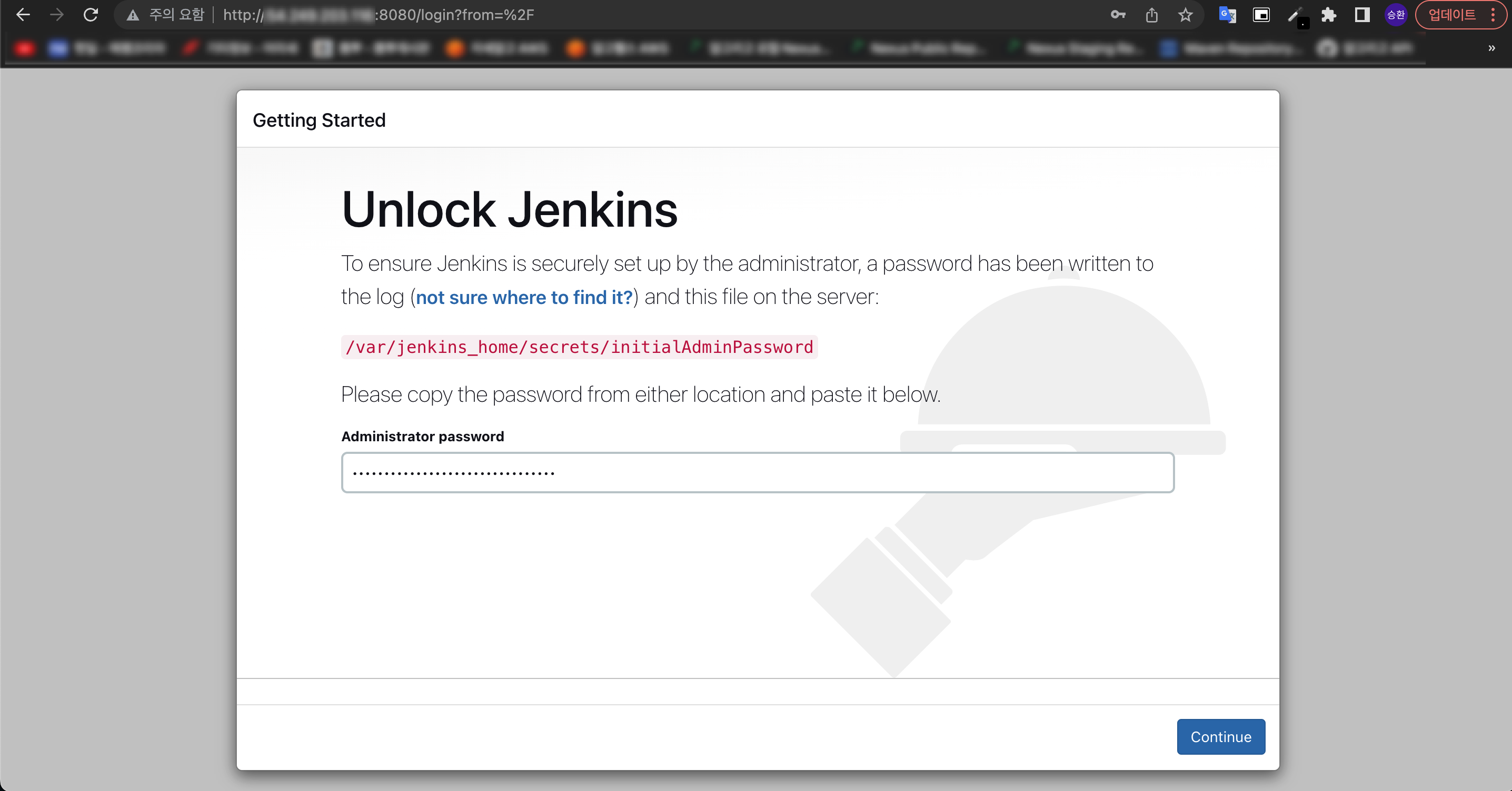 젠킨스 컨테이너를 실행했으면 http://<ip 주소>:<8080> 를 입력하여 젠킨스에 접속해줍니다.