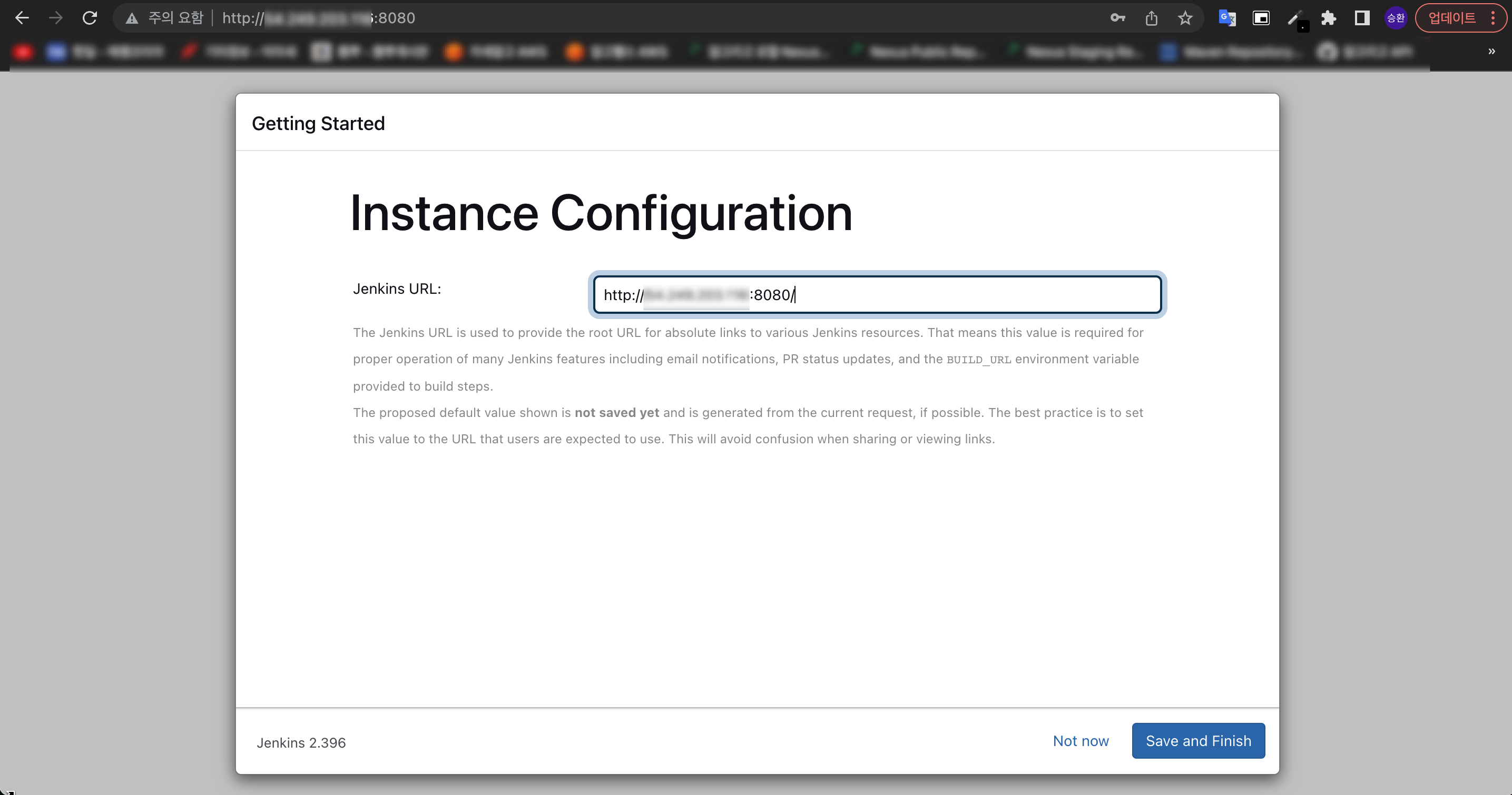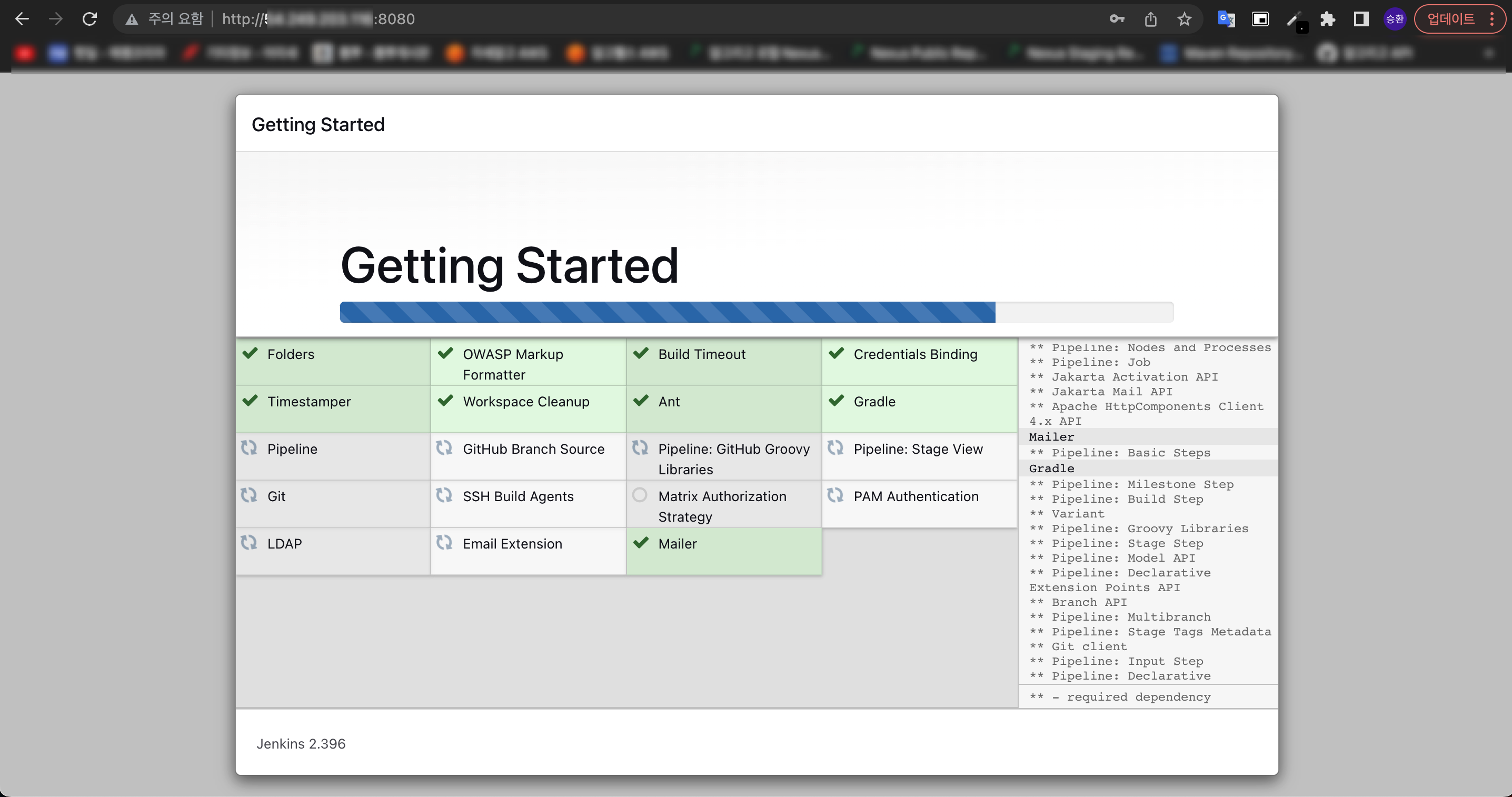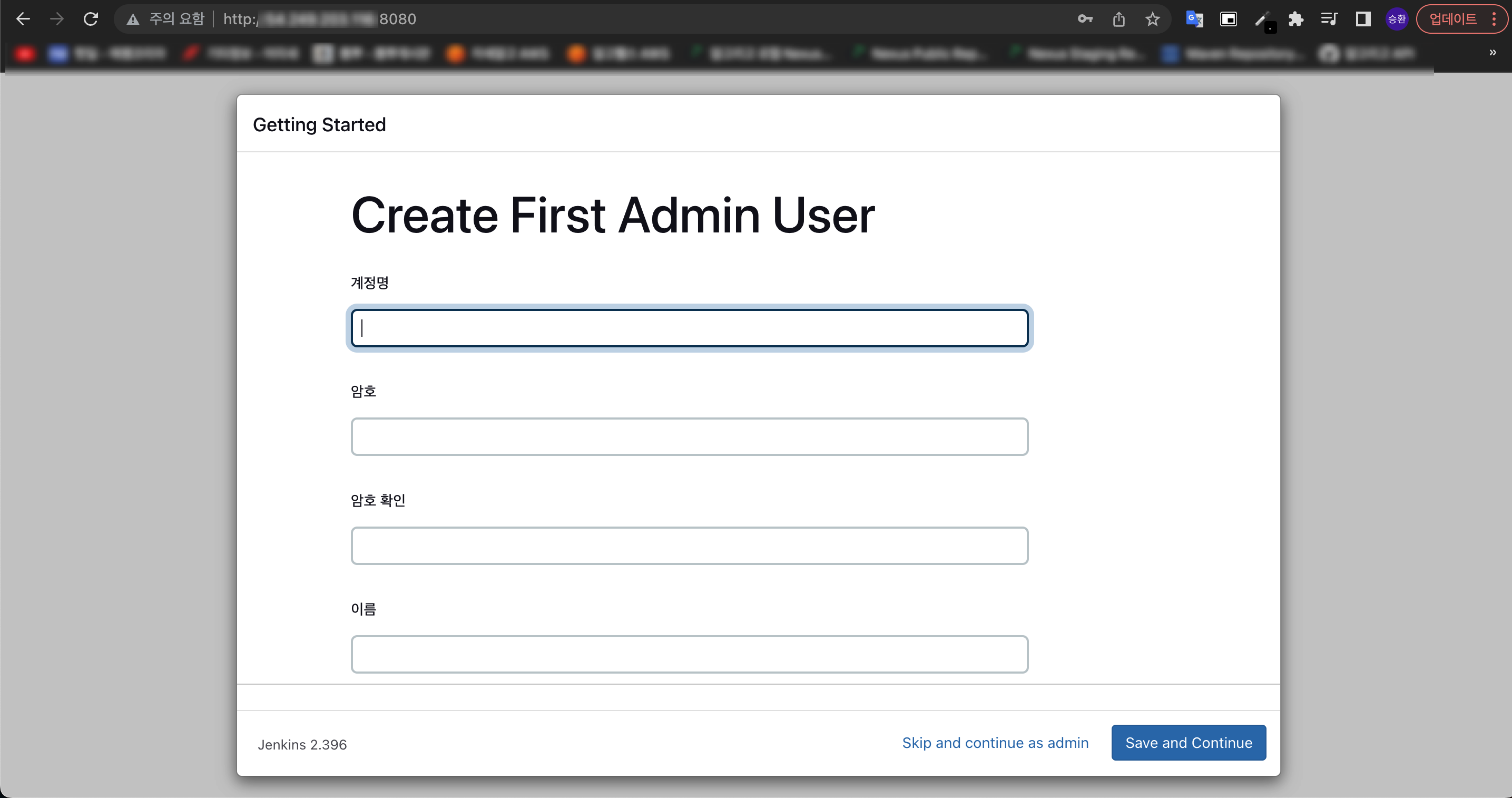 젠킨스 컨테이너를 실행했으면 http://<ip 주소>:<8080> 를 입력하여 젠킨스에 접속해줍니다.