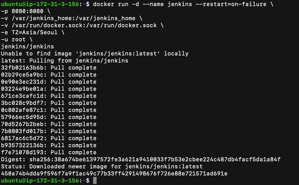 아래의 명령어로 젠킨스 컨테이너를 실행해줍니다.