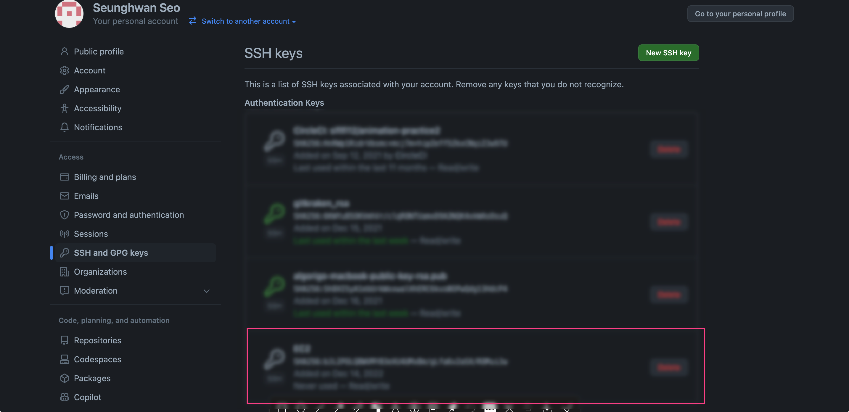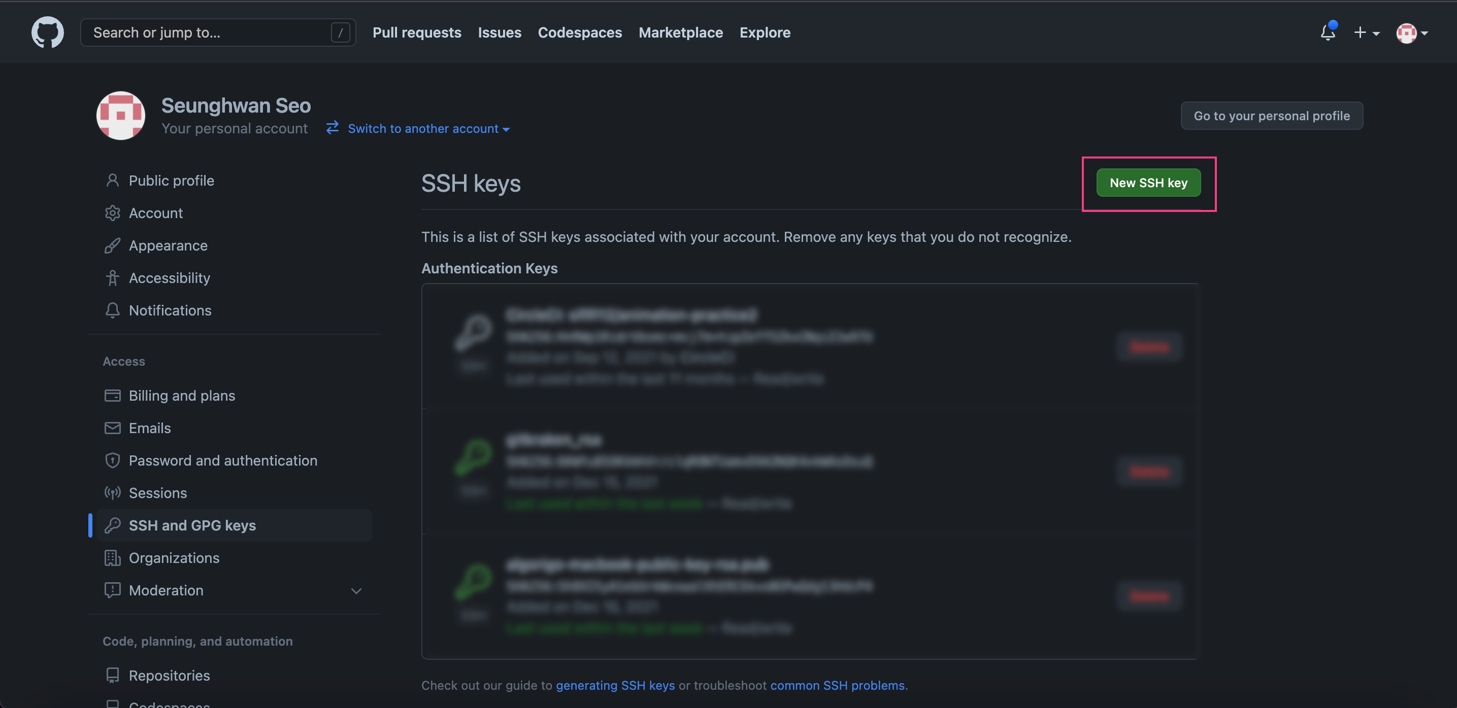 프로필 -> Settings -> SSH and GPG keys 로 이동합니다.