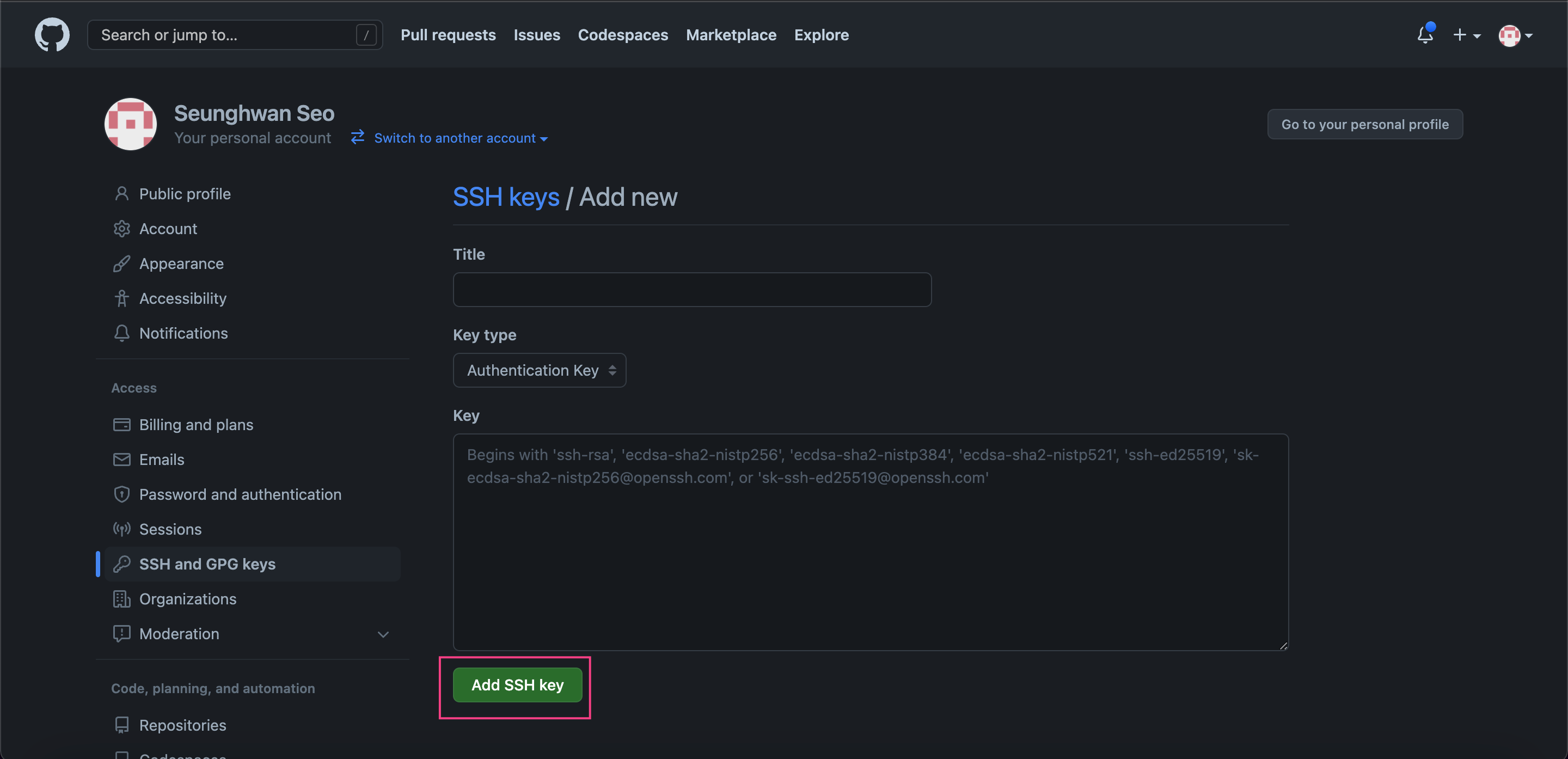 그리고 New SSH key 버튼을 눌러서 복사했던 ssh public key를 붙여 넣어주고 Add SSH key 버튼을 눌러줍니다.