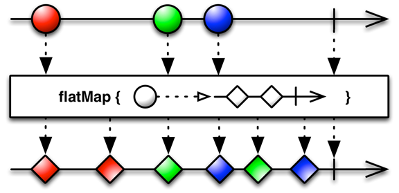 즉, RxJava의 flatMap 연산자는 Collections API의 flatMap과 매우 유사하며 데이터 하나당 Observable 하나가 만들어지고 최종적으로는 각각의 Observable이 flatten된 하나의 Observable을 구독하는 형태가 됩니다.
