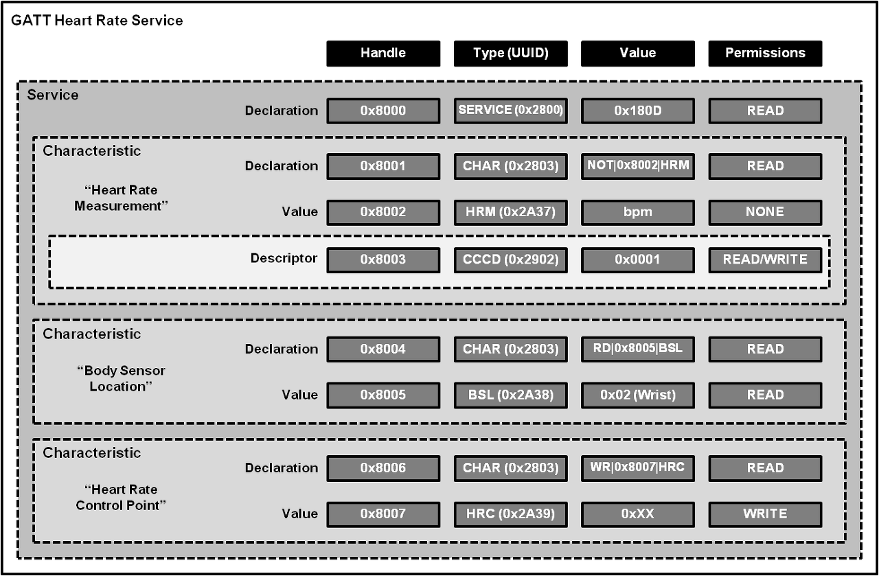 아래 다이어그램은 GATT Heart Profile Service를 보여줍니다.