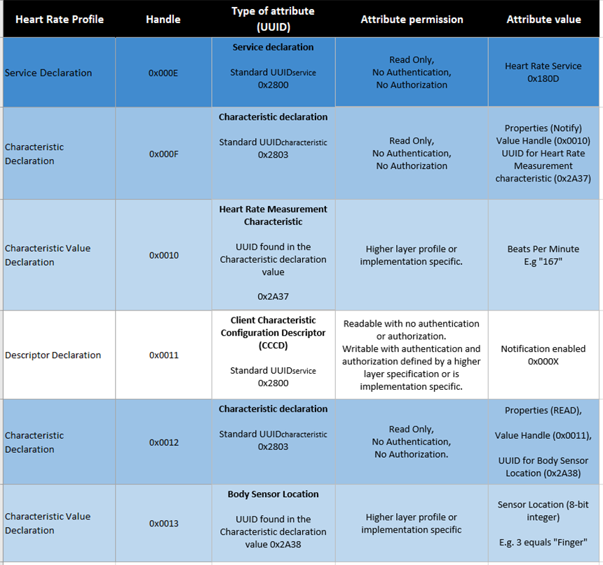 예를 들어 Heart Rate Profile이라는 주제로 어플리케이션을 만든다고 하면, 아래와 같은 Attribute들을 만들 수 있습니다.