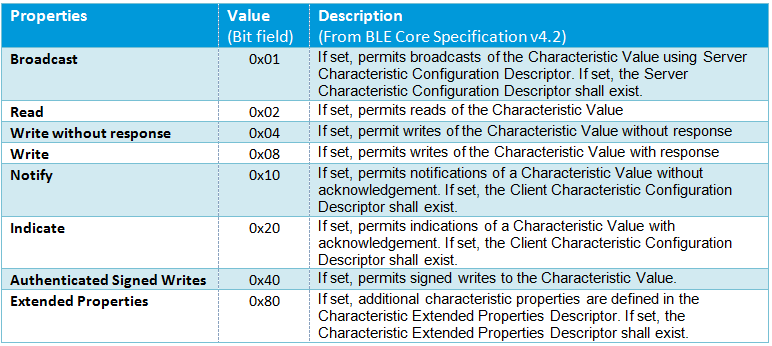 | Characteristic Properties | 1 | A bitfield listing the permitted operations on this characteristic |