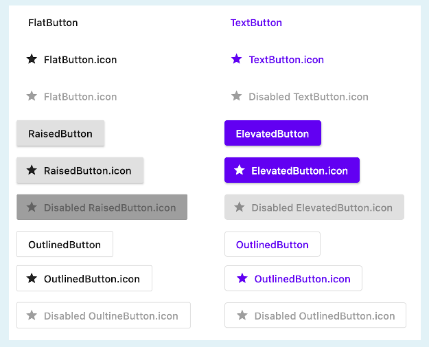 기존의 Material Buttons(FlatButton, RaisedButton, OutlineButton)들이 Deprecated 되었습니다. 대신 새로운 MaterialButton들을 사용해야 합니다. 새로운 Material Button들(TextButton, ElevatedButton, OutlinedButton)의 탄생 목적은 생성자 매개 변수와 테마를 통해 버튼을보다 유연하고 쉽게 구성하는 것이 목표입니다. 기존 버튼들은 각각 스타일을 변경해주어야 했지만 이제는 ButtonStyle 단일개체를 변경시켜주면 됩니다.