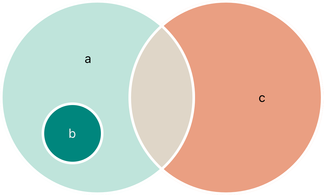 아래 그림은 세 집합 a, b, c를 나타내며 집합의 공통 요소는 겹쳐서 표현하고 있습니다. a는 b의 모든 요소를 포함하므로 집합 a는 b의 초집합(superset)이라 합니다. 반대로 b의 모든 요소가 a에 포함되어 있으므로 집합 b는 집합 a의 부분집합(subset)이라 합니다. 집합 b와 집합 c는 공통 요소가 없으므로 분리 집합 (disjoint) 라고 합니다.
