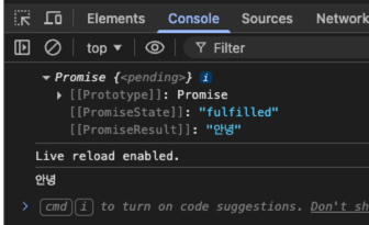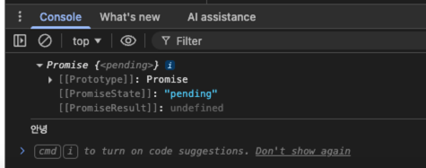 이때, PromiseResult가 undefined로 결과값이 저장되어있지 않은 것을 확인할 수 있는데, resolve() 함수 안에 값을 넣어주면 된다.