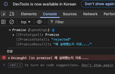 반면, reject()를 사용하면 콘솔에 아래와 같이 PromiseState와 PromiseReulst가 출력된다.